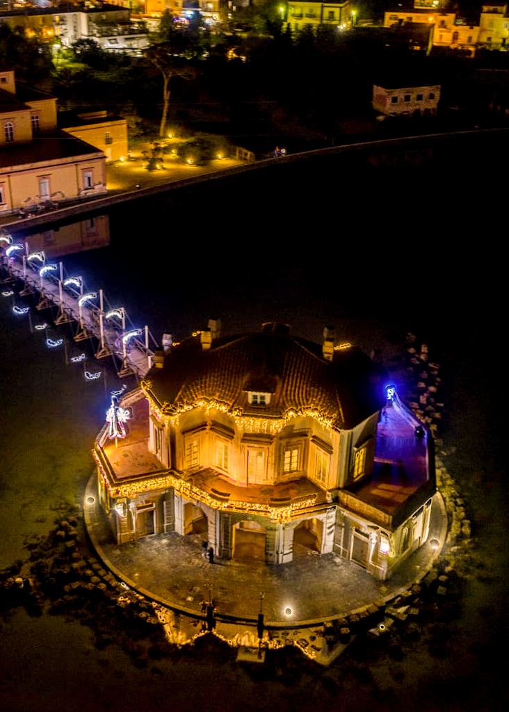 Avvolta dalle lucine è anche la Casina Vanvitelliana che appare, adesso più che mai, come una dimora da favola. Ninfa luccicante nel bel mezzo del Lago Fusaro.
